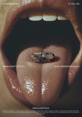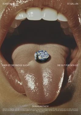 Kunstkick! – ein fiktives Projekt, das Kunst als gesunde Droge inszeniert. In einem Zweierteam haben wir eine visuelle Sprache entwickelt, die an Club- und Musikkultur erinnert, um junge Menschen zu erreichen. Unsere Botschaft: Kunst ist ein intensiver Trip für die Sinne – ganz ohne Nebenwirkungen. Mit einer provokanten Ästhetik wollten wir Neugier wecken und Aufmerksamkeit erregen. Ziel war es, Kunst als Quelle für Dopamin und Serotonin zu präsentieren – und die Wahrnehmung von Museen als langweilig zu durchbrechen.