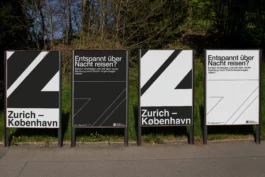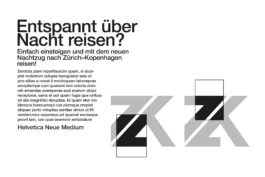 Für einen fiktiven Branding-Auftrag habe ich die Wort- und Bildmarke für den Nachtzug von Zürich nach Kopenhagen entworfen. Mein Logo stellt die Pfeile in Richtung Norden und Süden dar, abgeleitet aus der Form der Anfangsbuchstaben beider Städte. Anschliessend habe ich Ausschnitte aus dem Logo als Gestaltungselement für die verschiedenen Anwendungen genutzt.